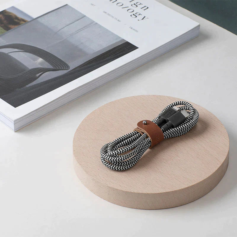 - Optimized for iPhones, iPads, and AirPods, this eco-friendly charging cable is designed with innovation: featuring 100% recycled PET braiding, a housing made from 100% recycled TPU, and a strap crafted from 75% recycled bonded leather.