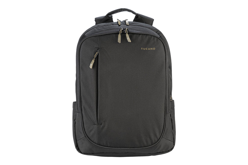 Business backpack made of material produced from recycled plastic and equipped with our AGS System, an elastic shoulder-strap suspension system designed to reduce the load on shoulders & back. The padded, lined interior features a double pocket to protect both a laptop & tablet. The front side has a zippered front pocket while the back comes with a security pocket, and a trolley strap. On the sides the backpack there are two roomy pockets for an umbrella and a water bottle.