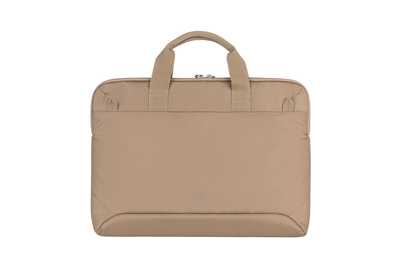 Super-slim bag for laptops up to 14 made of high-tech material with contrast-color details. Double handles and detachable shoulder strap made with webbing